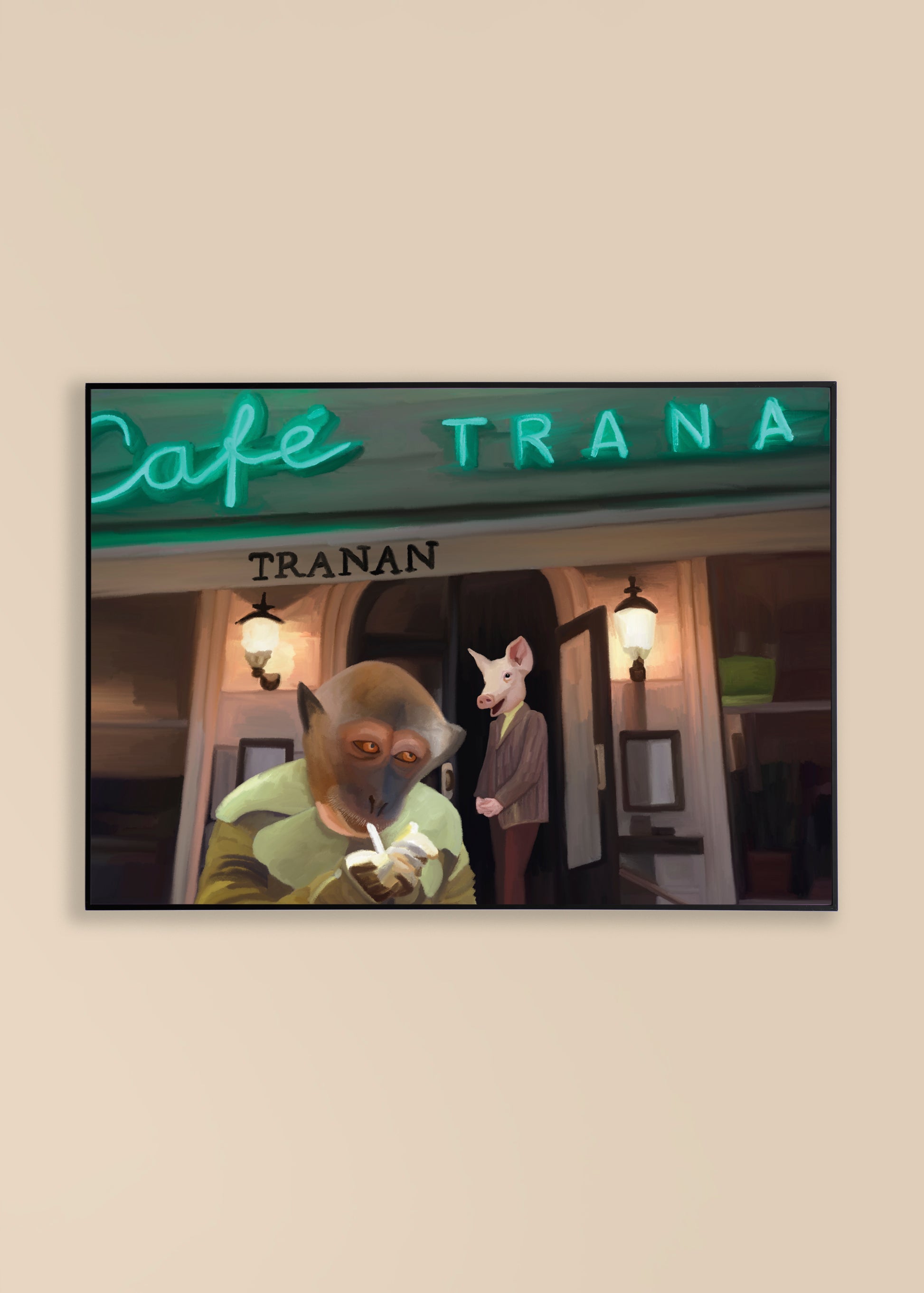 Ett färgstarkt motiv som skildrar en apa och en gris i mänskliga kläder utanför restaurang Tranan i Stockholm. "Jag finner något komiskt i hela fenomenet att vara människa, och kanske är vi mer underhållande att porträttera i vissa stadsdelar än andra. Det är också praktiskt att använda ett djurhuvud för att fånga en karaktär. Kort sagt, jag tycker att de konstruerade metoder vi har utvecklat för att dölja vårt ursprung är både rörande och absurda. Det finns något lockande i tanken att vi alla bara är grisar och grodor som har utvecklat sofistikerade manér." - Estelle Graf